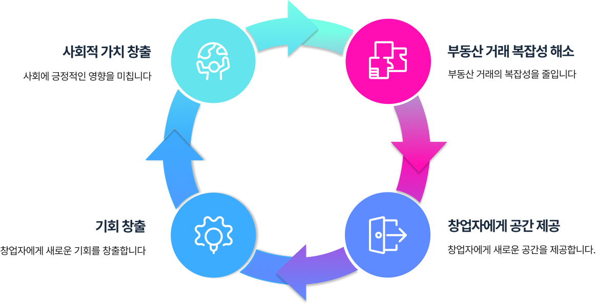 부동산 거래의 복잡성을 해소하고, 창업자에게는 새로운 공간과 기회를 제공하는 사회적으로 의미 있는 사업을 추구합니다.